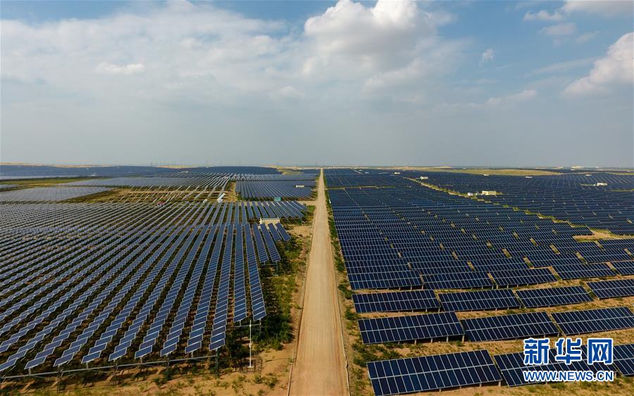 这是库布其沙漠生态太阳能发电综合示范地(8月1日无人机拍摄)。