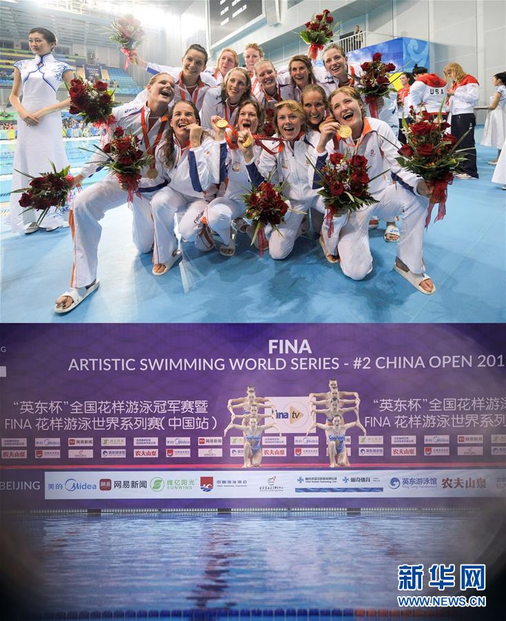 拼版照片下图显示的是2018年4月20日,在全国花样游泳冠军赛暨FINA花样游泳世界系列赛(中国站)比赛中,天津队选手参加集体技术自选项目比赛。新华社记者 费茂华 摄