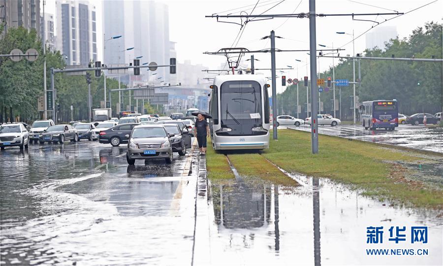 8月7日,在沈阳市浑南大道与朗日街交叉口附近,有轨电车和部分汽车等待通行。当日,沈阳出现强降雨天气,部分路段积水严重。 新华社记者 杨青 摄