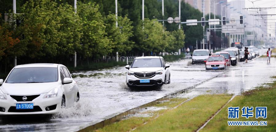 8月7日,车辆通过沈阳市浑南大道与朗日街交叉口附近的积水路段。当日,沈阳出现强降雨天气,部分路段积水严重。 新华社记者 杨青 摄