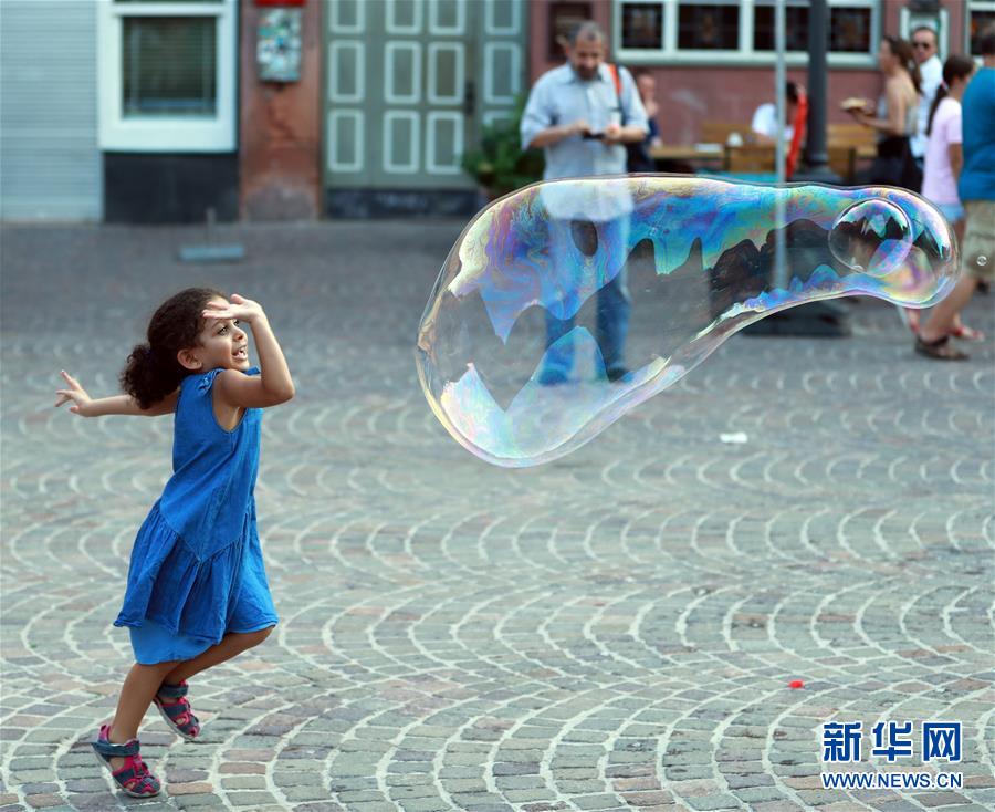 8月6日,一名小女孩在德国法兰克福举办的“美因河节”上追逐肥皂泡。8月3日至6日举办的“美因河节”起源于法兰克福当地渔民和船夫的节日,已有数百年的悠久历史。 新华社记者 罗欢欢 摄