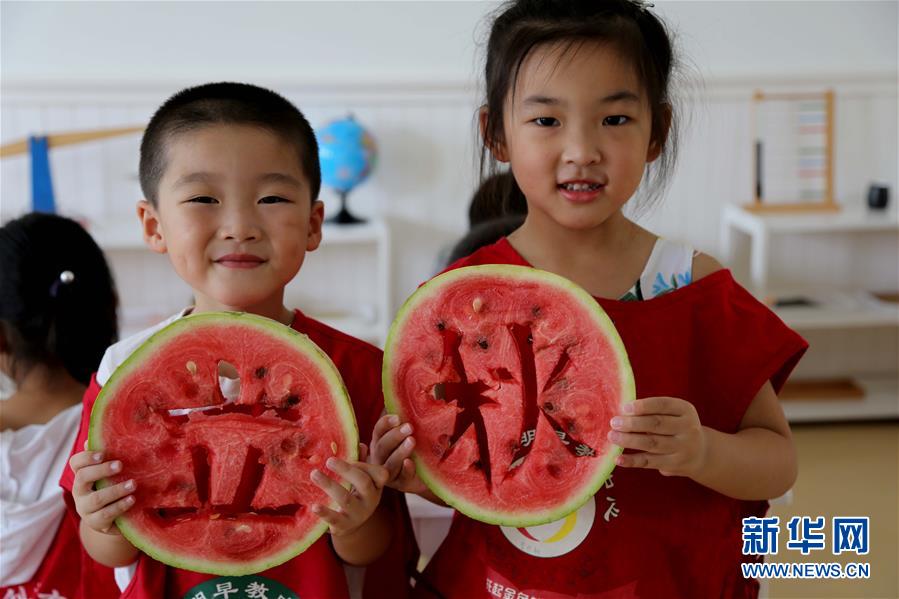 8月7日,江苏省连云港市赣榆区一家幼儿园的小朋友在参加“啃秋”活动。新华社发(邵世新 摄)