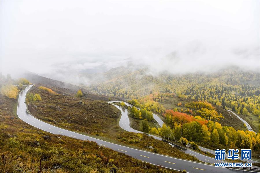 这是通往新疆喀纳斯景区禾木村的道路(2017年9月23日摄)。 新华社记者 赵戈 摄