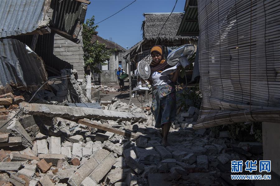 8月8日,在印度尼西亚龙目岛地震灾区,灾民在倒塌的房屋中收拾物品。 新华社记者吕小炜摄
