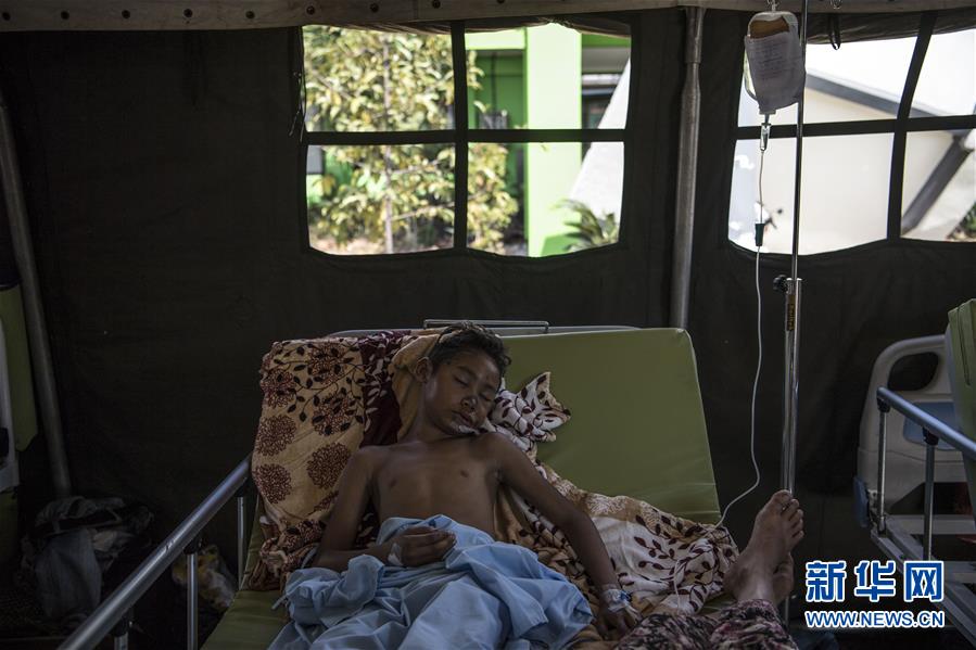 8月8日,在印度尼西亚龙目岛地震灾区,因医院倒塌,灾民在帐篷内接受治疗。新华社记者吕小炜摄