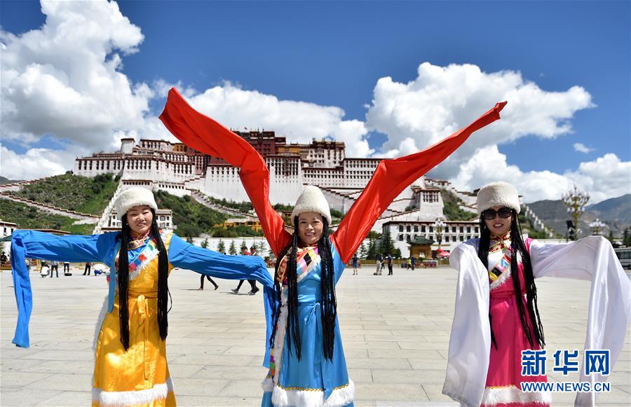 8月8日,游客穿着藏族服饰在布达拉宫广场留影。 新华社记者 觉果 摄