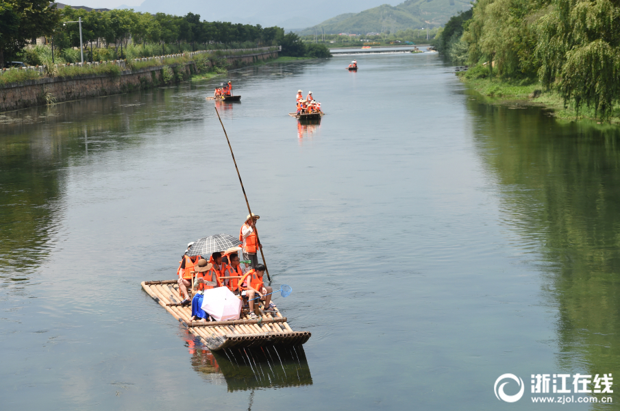 8月9日,杭州持续高温,最高气温达36℃,酷热难熬,在余杭双溪漂流景区,游客人数骤增,他们乘竹筏享受水上清凉。(浙江在线记者 吴元峰 摄)