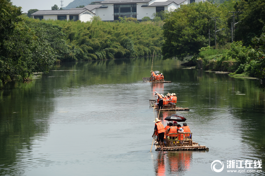 8月9日,杭州持续高温,最高气温达36℃,酷热难熬,在余杭双溪漂流景区,游客人数骤增,他们乘竹筏享受水上清凉。(浙江在线记者 吴元峰 摄)