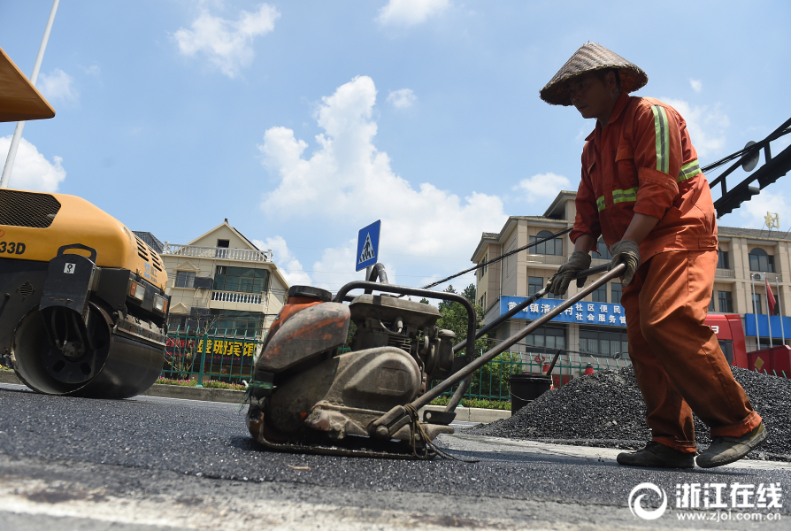 8月9日,杭州持续高温,骄阳似火,在04省道余杭黄湖段,地表温度达50℃,余杭公路养护工依然战斗在高温下,修补破损的路面,保障省道交通畅通。(浙江在线记者 吴元峰 摄)