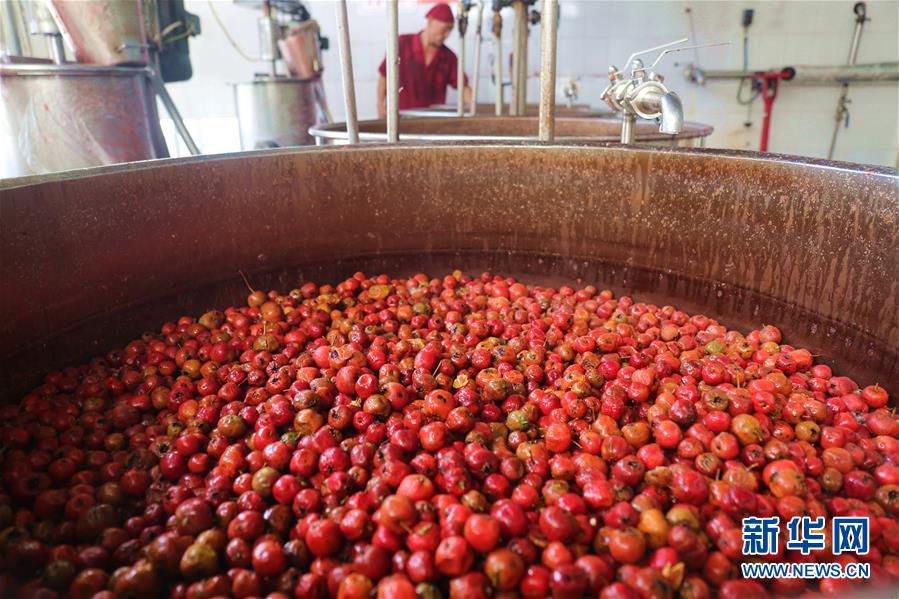 近年来,位于燕山腹地的河北省承德市营子区以打造山楂特色小镇为抓手,采取“现代农业园区+科研基地+互联网销售”模式,着力延伸山楂深加工产业链,进一步促进果品产业提档升级。 目前,营子区开发出巧克力味、蜂蜜味、紫薯味等山楂休闲食品和罐头、饮品等10余系列数百种产品,除供应国内市场外,还远销加拿大、美国、日本、韩国、澳大利亚等国家和地区,产业带动众多农户脱贫致富。 新华社发(刘环宇 摄)