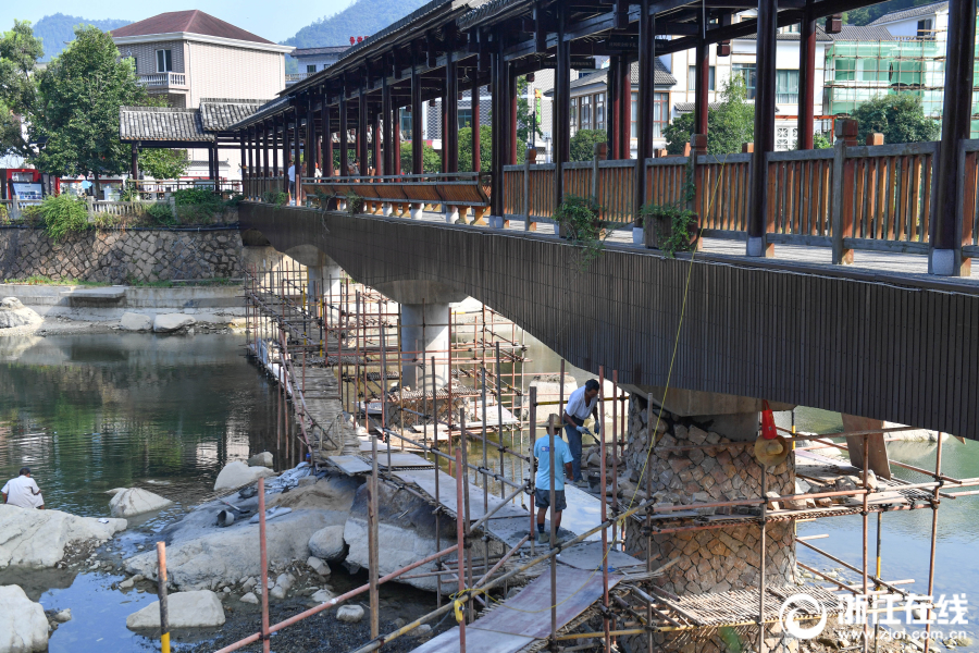 浙江在线8月9日讯(浙江在线记者 董旭明 刘健 摄)8月9日,淳安县下姜村村民正在整修村里的一座廊桥。他们除了对桥墩进行加固外,还将桥上有腐烂迹象的木制围栏全部更换,排除安全隐患,确保村民和游客安全。