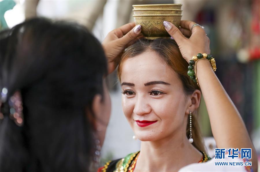 沙拉麦提古丽为即将表演“顶碗舞”的员工卡米拉·阿布拉放置顶在头上的铜碗(8月7日摄)。 新华社记者马锴摄