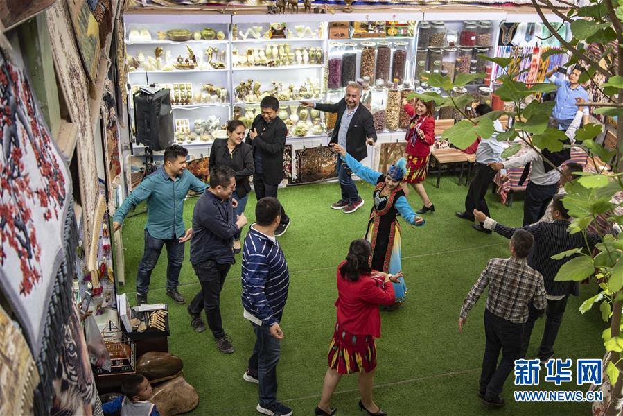 沙拉麦提古丽(中)在院内与游客一起舞蹈。院内的货架上摆满了挂毯、玉器和其他当地特产,供游客选购(5月26日摄)。 新华社记者马锴摄