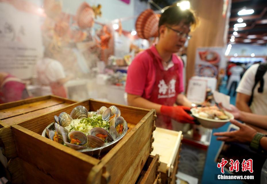 观众在台北2018台湾美食展购买海鲜。中新社记者 张宇 摄