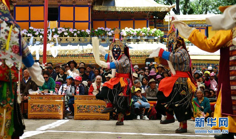 8月12日,西藏日喀则市南木林县空欧藏戏队在拉萨市罗布林卡表演藏戏《特巴丹巴》。