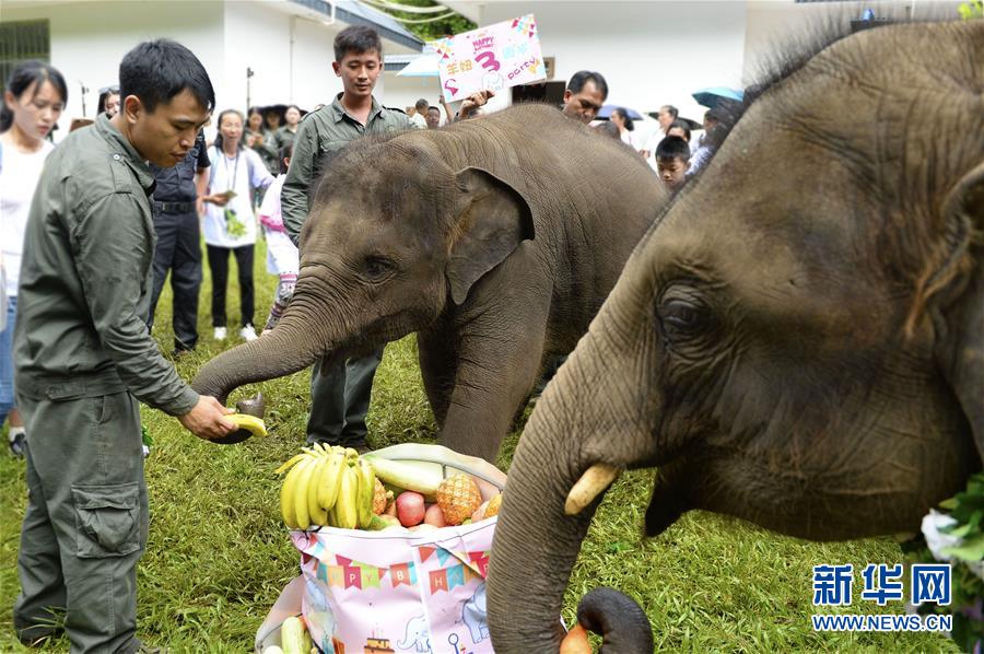 8月12日,救助象“羊妞”(左)在享用“生日蛋糕”。 新华社发(谢子艺 摄)