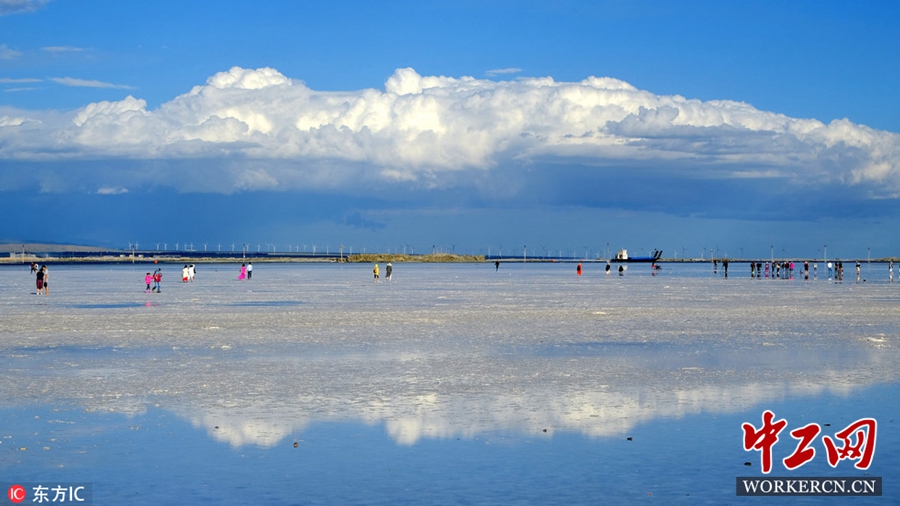 2018年7月23日,青海。茶卡盐湖是青海省海西州乌兰县境内的4A级旅游景区,素有“天空之镜”的美誉,以纯净、倒影、水天相交,如梦似幻,盐湖与山峰交相辉映的高原独特自然风光,吸引着无数省内外游客观光游览。图片来源:东方IC