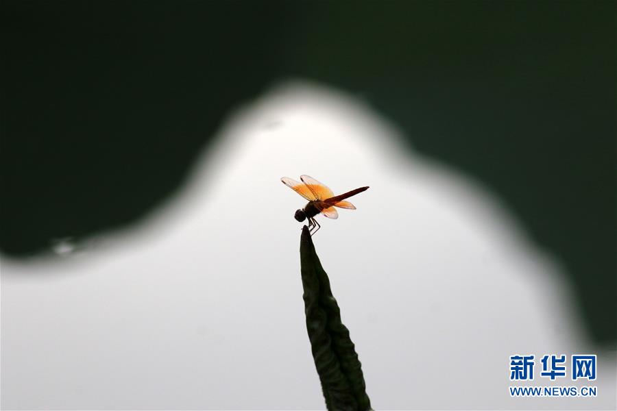 8月11日,在江苏省淮安市钵池山公园,蜻蜓在荷叶上停留。 新华社发(贺敬华 摄)