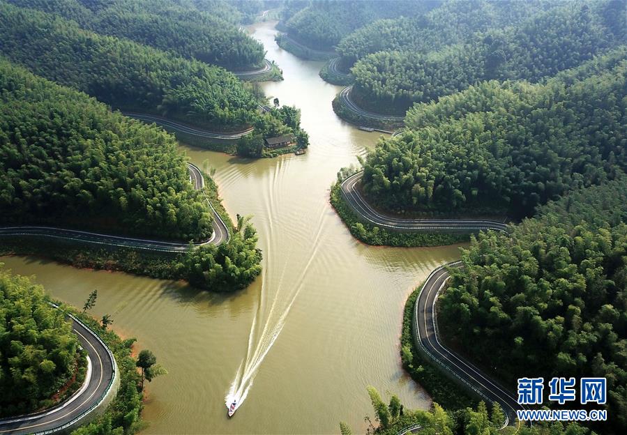 8月13日,游客乘坐快艇在赤水竹海国家森林公园竹海湖上游览(无人机拍摄)。 目前,位于贵州省赤水市的竹海国家森林公园进入观竹旅游旺季,众多游客走进这片绿色海洋,享受清凉和惬意。 新华社发(王长育 摄)