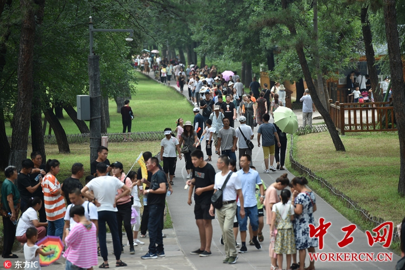 八月上旬的承德避暑山庄,天气闷热,空气湿度很大,排队进入山庄参观的游客源源不断,景区长亭座椅上、参观道路上、桥上都是人。(图片来源东方IC)
