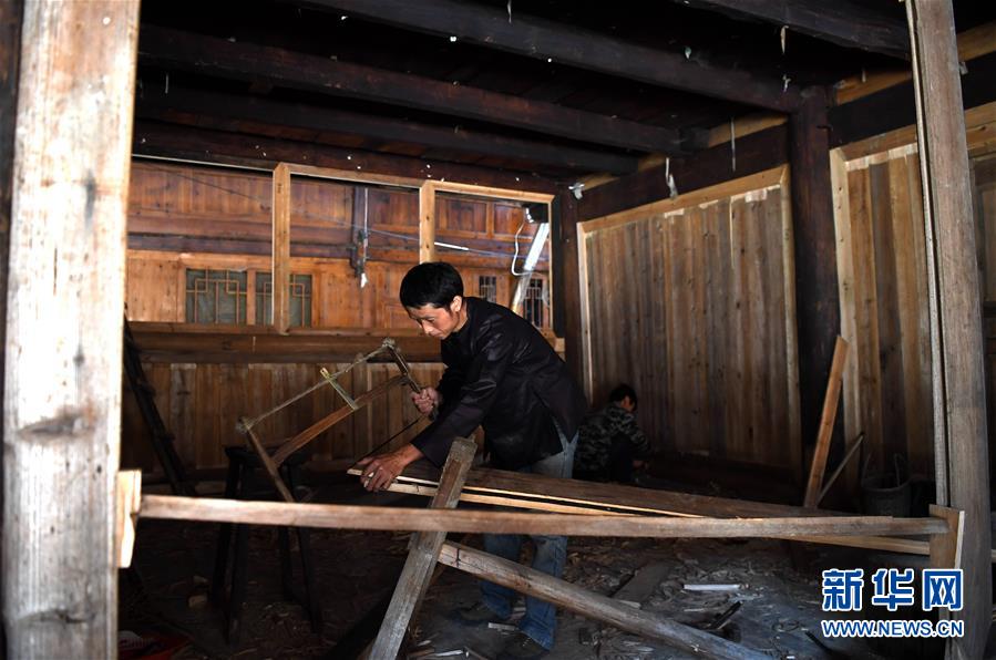 8月14日,村民在宰荡侗寨正在改造的老木房里作业。 今年以来,贵州省黔东南苗族侗族自治州榕江县栽麻镇宰荡侗寨在充分利用既有资源优势的同时,采取“公司投入+农房入股+村委管理+村民动手”的方式,让村民自己动手,在保持原貌的基础上,对闲置资源进行改造升级、转变功能等,打造“侗歌”“侗餐”等特色乡村游品牌项目,推出乡村旅游升级版,助力脱贫攻坚。 新华社发(王炳真 摄)