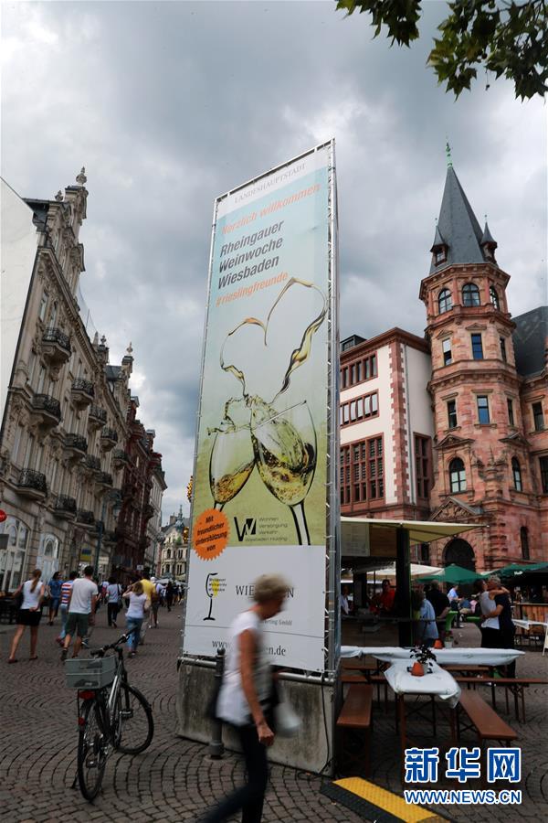 8月14日,在德国黑森州首府威斯巴登,人们参加莱茵高葡萄酒节。 新华社记者罗欢欢摄