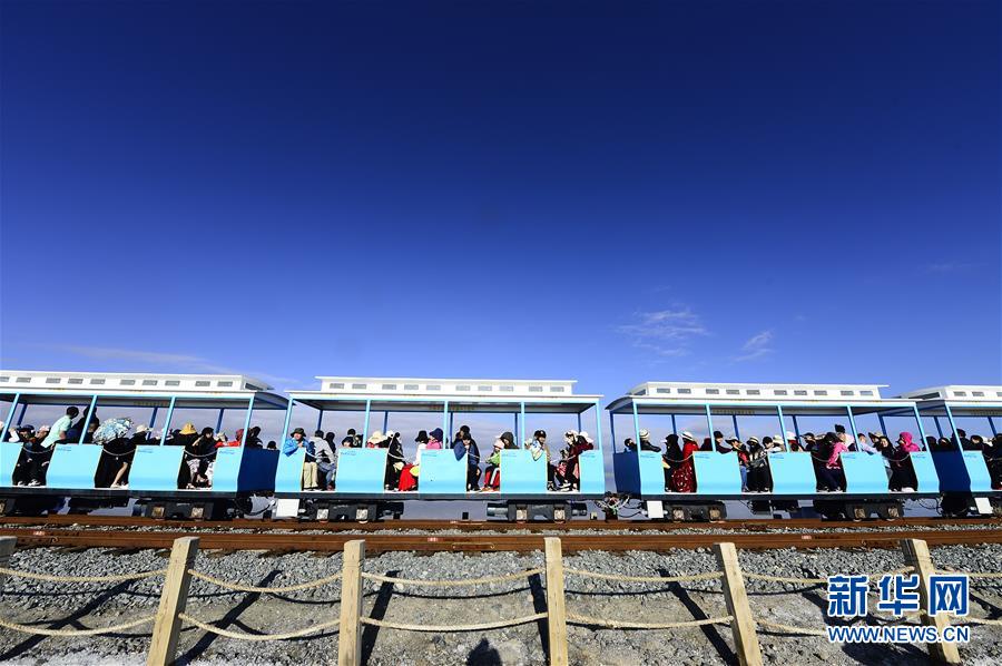 一列景区观光火车从茶卡盐湖景区内经过(8月14日摄)。 新华社记者张宏祥摄