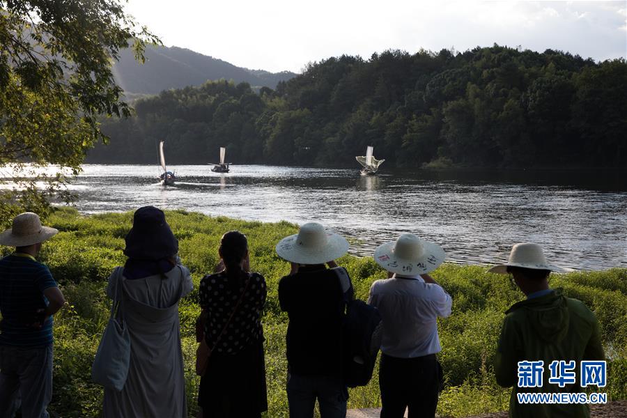 8月15日,在丽水市莲都古堰画乡小镇,游客在拍摄渔民捕鱼画面。 新华社记者 金立旺 摄