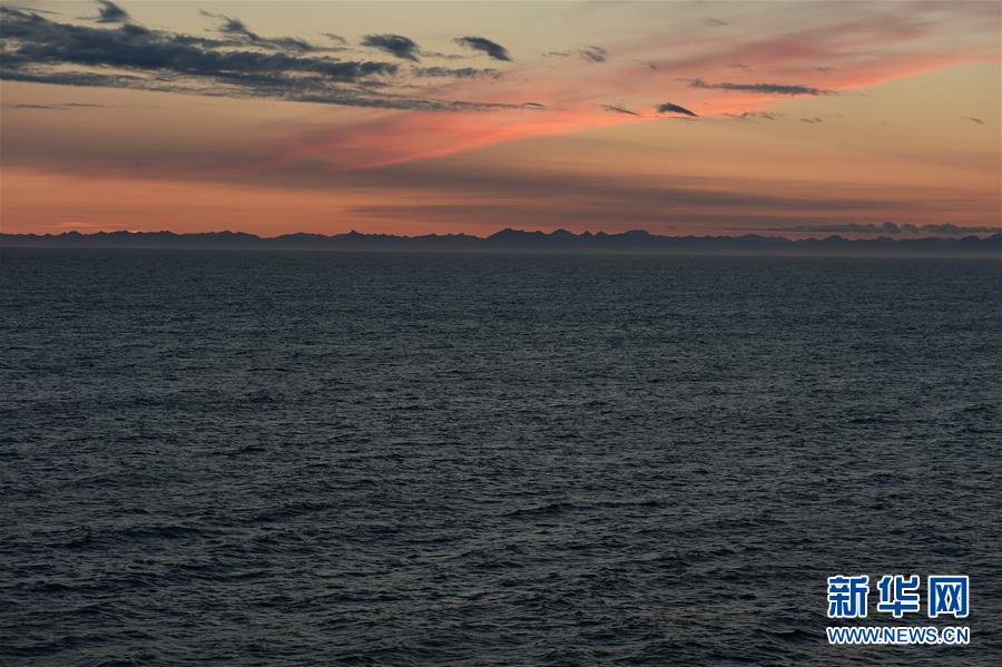 这是8月15日在中远海运“天恩”轮上拍摄的日落,远处为俄罗斯勘察加半岛。新华社记者刘红霞摄