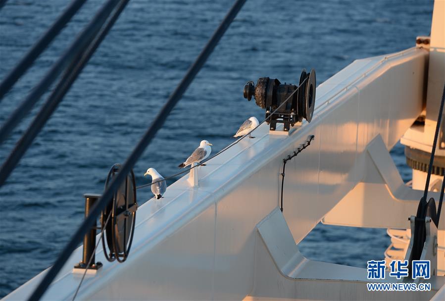 8月15日,在西北太平洋海域,海鸟停留在中远海运“天恩”号货轮上。新华社记者刘红霞摄
