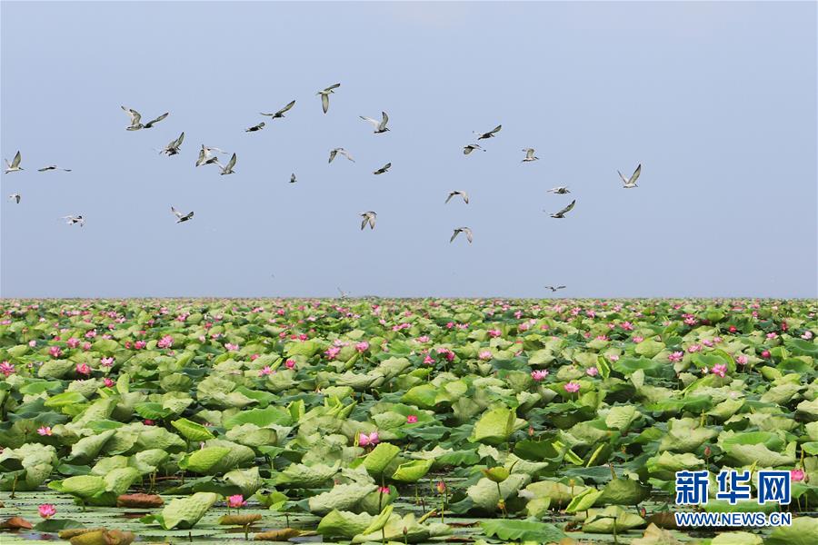 8月15日拍摄的洪湖风光。近日,位于湖北省的洪湖湖面上荷叶田田,水鸟翱翔,景色美不胜收。洪湖是中国第七大淡水湖,过去由于大量围网养殖等原因,水质恶化,水生生态系统遭到严重破坏。2016年开始,洪湖逐步拆除围网,禁止渔业养殖,全面禁捕,对湖泊生态进行修复。如今,洪湖水质得到明显改善,“浪打浪”美景逐步重现。新华社记者 隋先凯 摄