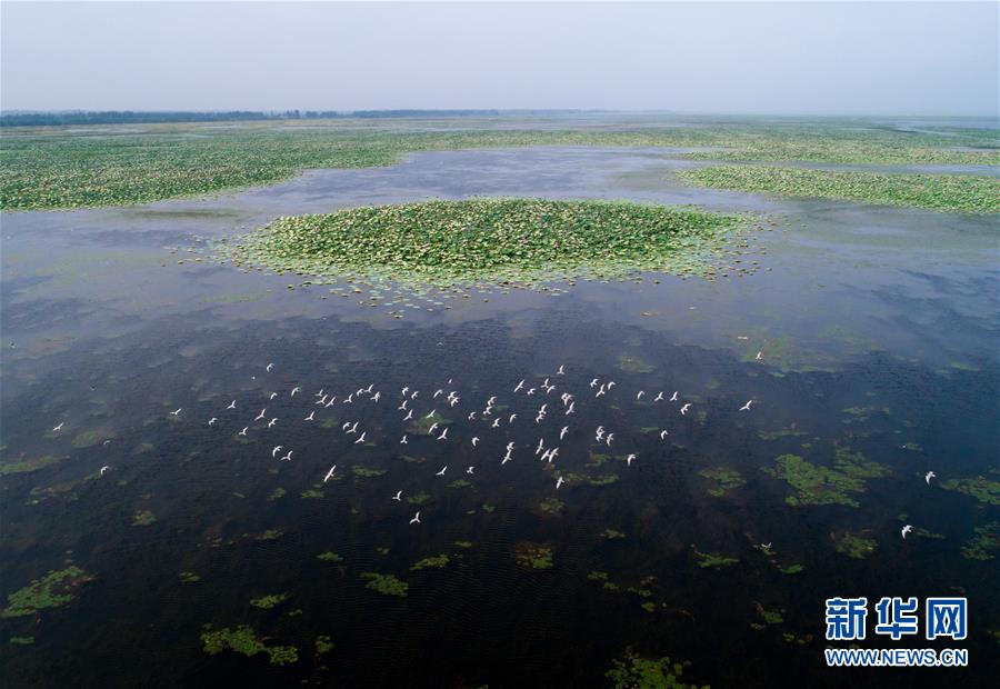 8月15日无人机拍摄的洪湖风光。近日,位于湖北省的洪湖湖面上荷叶田田,水鸟翱翔,景色美不胜收。洪湖是中国第七大淡水湖,过去由于大量围网养殖等原因,水质恶化,水生生态系统遭到严重破坏。2016年开始,洪湖逐步拆除围网,禁止渔业养殖,全面禁捕,对湖泊生态进行修复。如今,洪湖水质得到明显改善,“浪打浪”美景逐步重现。新华社记者 熊琦 摄