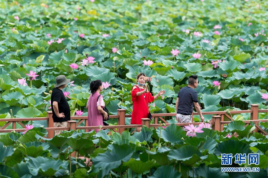 8月16日,游客在洪湖生态旅游风景区赏荷游玩。近日,位于湖北省的洪湖湖面上荷叶田田,水鸟翱翔,景色美不胜收。洪湖是中国第七大淡水湖,过去由于大量围网养殖等原因,水质恶化,水生生态系统遭到严重破坏。2016年开始,洪湖逐步拆除围网,禁止渔业养殖,全面禁捕,对湖泊生态进行修复。如今,洪湖水质得到明显改善,“浪打浪”美景逐步重现。新华社记者 王海京 摄