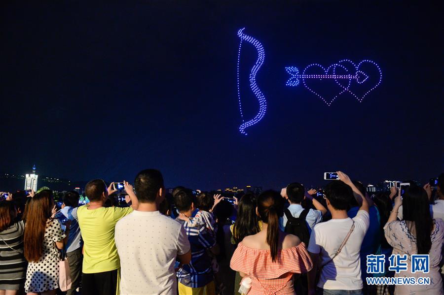 8月16日,无人机在橘子洲头摆出弓箭和爱心的图案。 新华社记者 张笑宇 摄