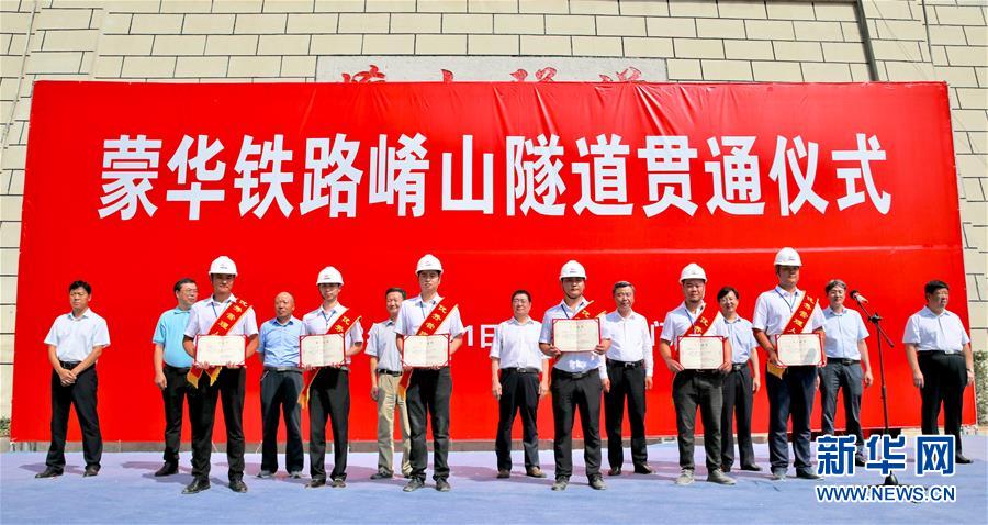 8月21日,在河南省三门峡市境内举行的蒙华铁路崤山隧道贯通仪式上,被评为“优秀管理人员”称号的工作人员接受表彰。
