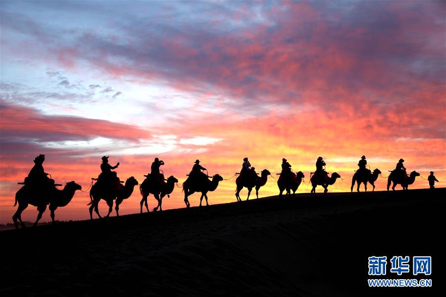 游客在甘肃省敦煌市鸣沙山月牙泉景区参观游览(8月19日摄)。
