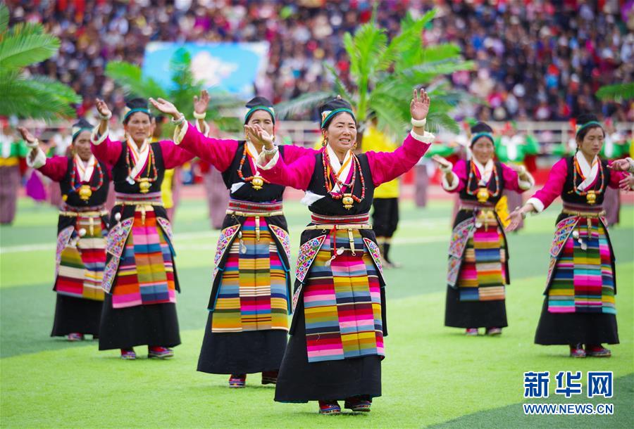 8月26日,日喀则农牧民群众演员身着特色民族服饰在开幕式上表演。