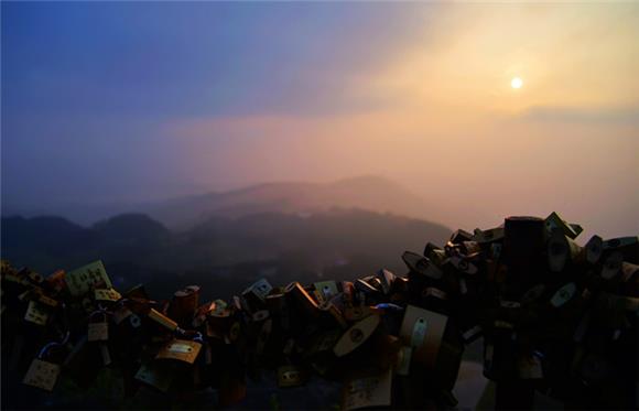 太阳越升越高,晨雾袭来,紧密锁在古剑山阳桥处的各种锁具若隐若现,令人着迷。 通讯员 孙治波 摄