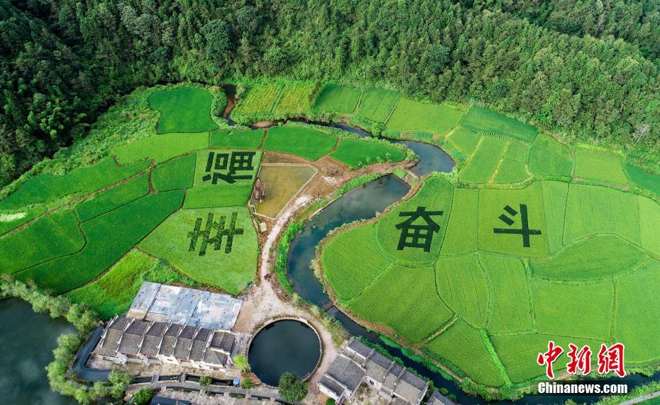 8月26日,航拍江西婺源瑶湾田园风光。孟秋时节,江西婺源十里瑶湾景区游人如织,小桥流水、湖山映衬,彩色稻田用“幸福”和“奋斗”点缀出一幅美丽的田园生态画卷。鲍赣生 摄