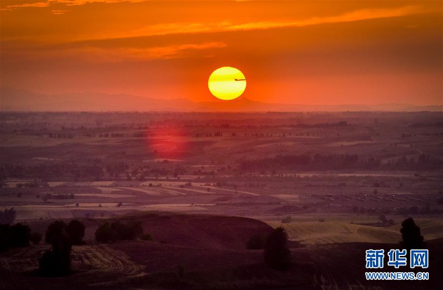这是8月25日在新疆木垒哈萨克自治县天山木垒中国农业公园拍摄的落日。 金秋时节,新疆木垒哈萨克自治县的旱地小麦逐渐成熟,给大地铺上一条金色的“毯子”。 新华社记者赵戈摄