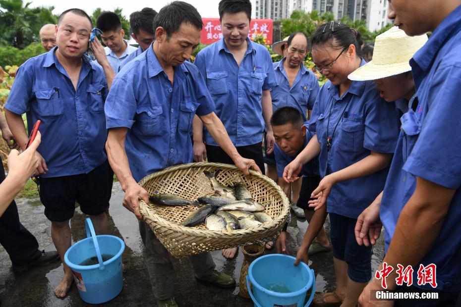 8月29日,重庆一工厂举行楼顶“开心农场”稻谷田里捉鱼比赛,为员工释放工作压力。图为参赛员工展示自己所捉的鱼。中新社记者 陈超 摄