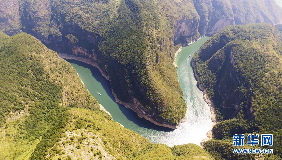 8月29日无人机拍摄的重庆巫山小三峡鱼头湾景色。 鱼头湾位于长江支流大宁河流域的重庆市巫山县小三峡滴翠峡,因形似鲢鱼头而得名。初秋时节,鱼头湾一带漫江碧透、景色如画。 新华社记者 王全超 摄