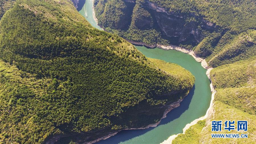 8月29日无人机拍摄的重庆巫山小三峡鱼头湾景色。 鱼头湾位于长江支流大宁河流域的重庆市巫山县小三峡滴翠峡,因形似鲢鱼头而得名。初秋时节,鱼头湾一带漫江碧透、景色如画。 新华社记者 王全超 摄