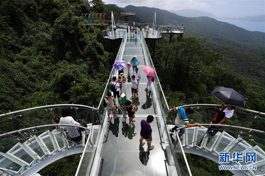 8月31日,游客在玻璃栈道上参观游览。 近日,位于海南省三亚市亚龙湾热带天堂森林公园的大佛石全海景玻璃栈道开始正式营业。凌空而建的玻璃栈道全长400米,游客可将亚龙湾的美景尽收眼底。 新华社记者郭程摄
