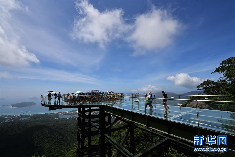 8月31日,游客在玻璃观景平台上参观游览。 近日,位于海南省三亚市亚龙湾热带天堂森林公园的大佛石全海景玻璃栈道开始正式营业。凌空而建的玻璃栈道全长400米,游客可将亚龙湾的美景尽收眼底。 新华社记者郭程摄