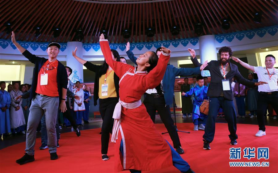 8月30日,鄂尔多斯市蒙古族中学的学生与中外大学生一起跳起欢快的舞蹈。新华社记者潘旭/摄