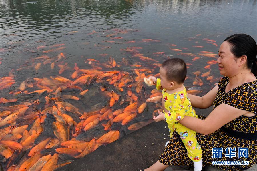 一位老人带着孙女在福鼎市桐山溪边赏鱼喂鱼(9月4日摄)。 新华社记者张国俊摄