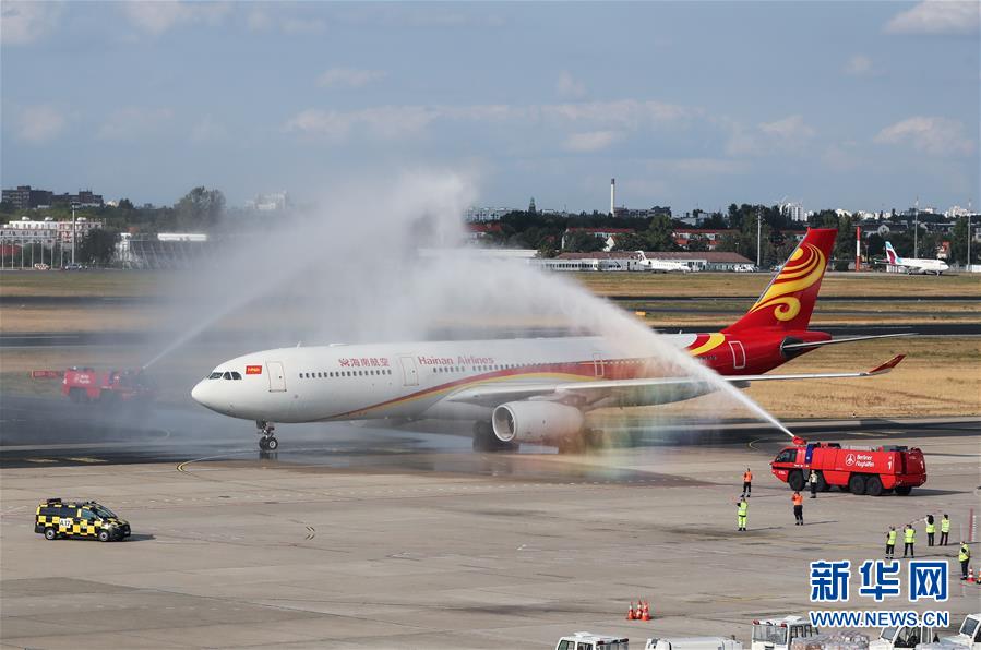9月5日,在德国柏林,泰格尔机场工作人员为一架抵达的海南航空客机举行欢迎仪式。 海南航空控股股份有限公司和德国柏林泰格尔机场5日在柏林举办新闻发布会和庆典,庆祝海南航空北京至柏林航线开通十周年。 新华社记者 单宇琦 摄