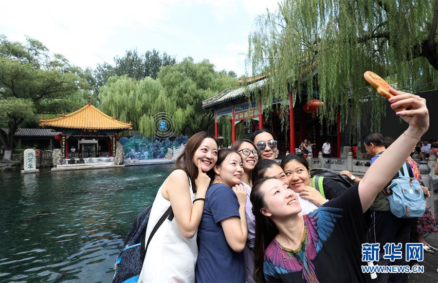 9月6日,游客在趵突泉旁拍照留念。 新华社发(赵晓明 摄)