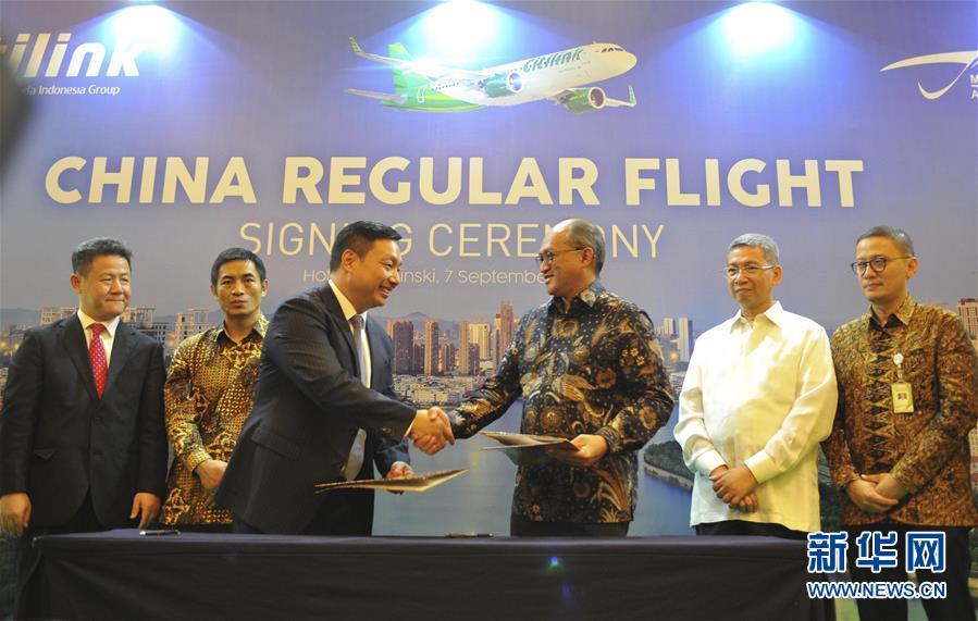 这是9月7日在印度尼西亚雅加达拍摄的签约仪式现场。 印度尼西亚连城航空公司7日下午在雅加达宣布,将从下月起正式开通印尼至中国昆明、厦门和南昌三个城市的定期直飞航线,以吸引更多中国游客前往印尼旅游。连城航空公司当天与中国美凯航空服务集团签署合作协议,委任其为连城航空在中国的总代理,为中国客户提供服务。 新华社发(祖卡南 摄)